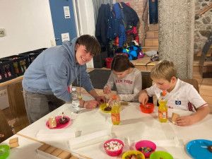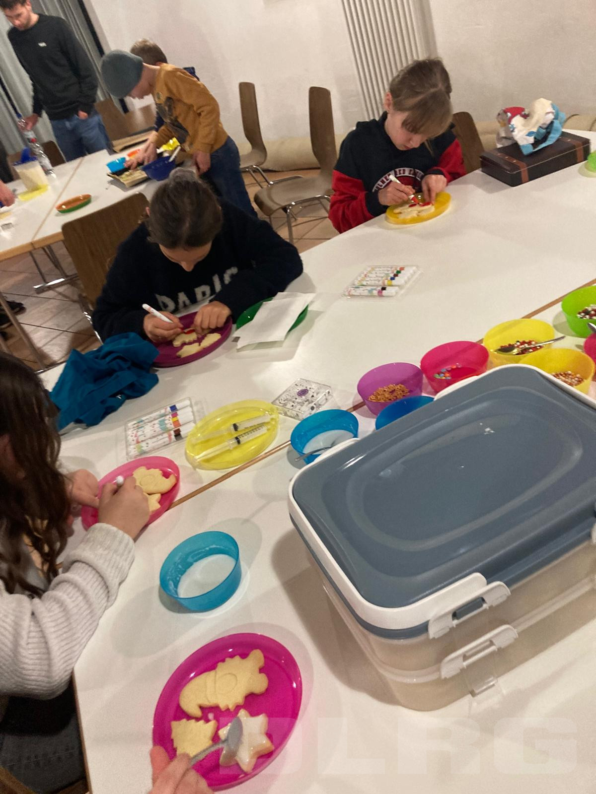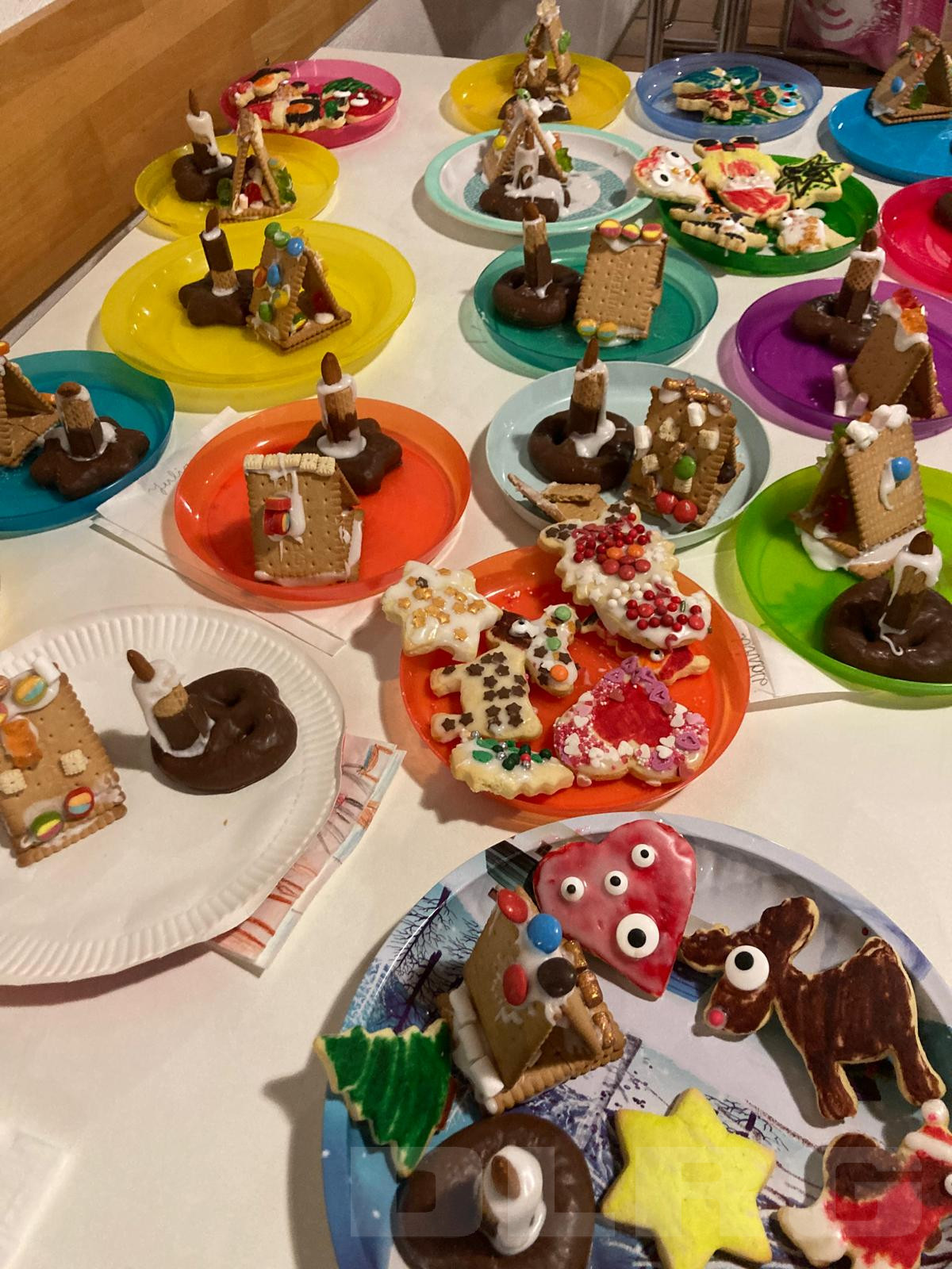 So wurden an einem Tisch Plätzchen ausgestochen und verziert, an einem weiteren Tisch die vorgebackenen Plätzchen mit Lebensmittelstiften angemalt und mit Zuckerguss und Streusel kreativ gestaltet. Aus Keksen und Zuckerguss Häuschen und Kerzen zusammengebaut und am letzten Tisch verschiedene Plätzchen wie Vanillekipferl, Zimtschnecken, Marmeladetaler und Schokoengelsaugen geformt.